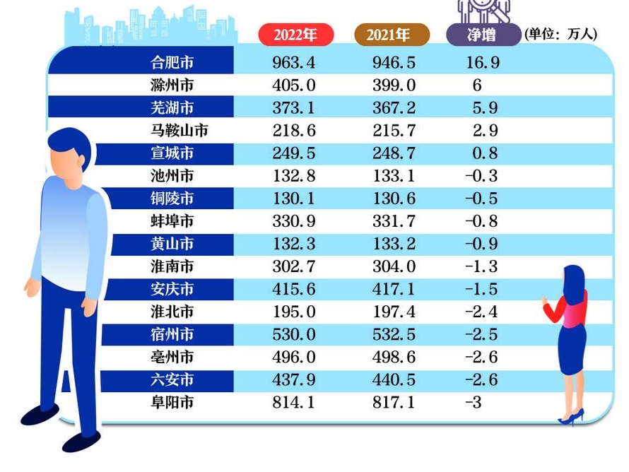 据best365体育正不正规_365天第三季无删除完整翻译_365国际速发彩票商报报道,近期,best365体育正不正规_365天第三季无删除完整翻译_365国际速发彩票各市陆续发布2022年常住人口数据。 较之2021年,best365体育正不正规_365天第三季无删除完整翻译_365国际速发彩票十六个市中,合肥、滁州、芜湖、马鞍山、宣城五市保持常住人口增长态势;其他11市常住人口减少。